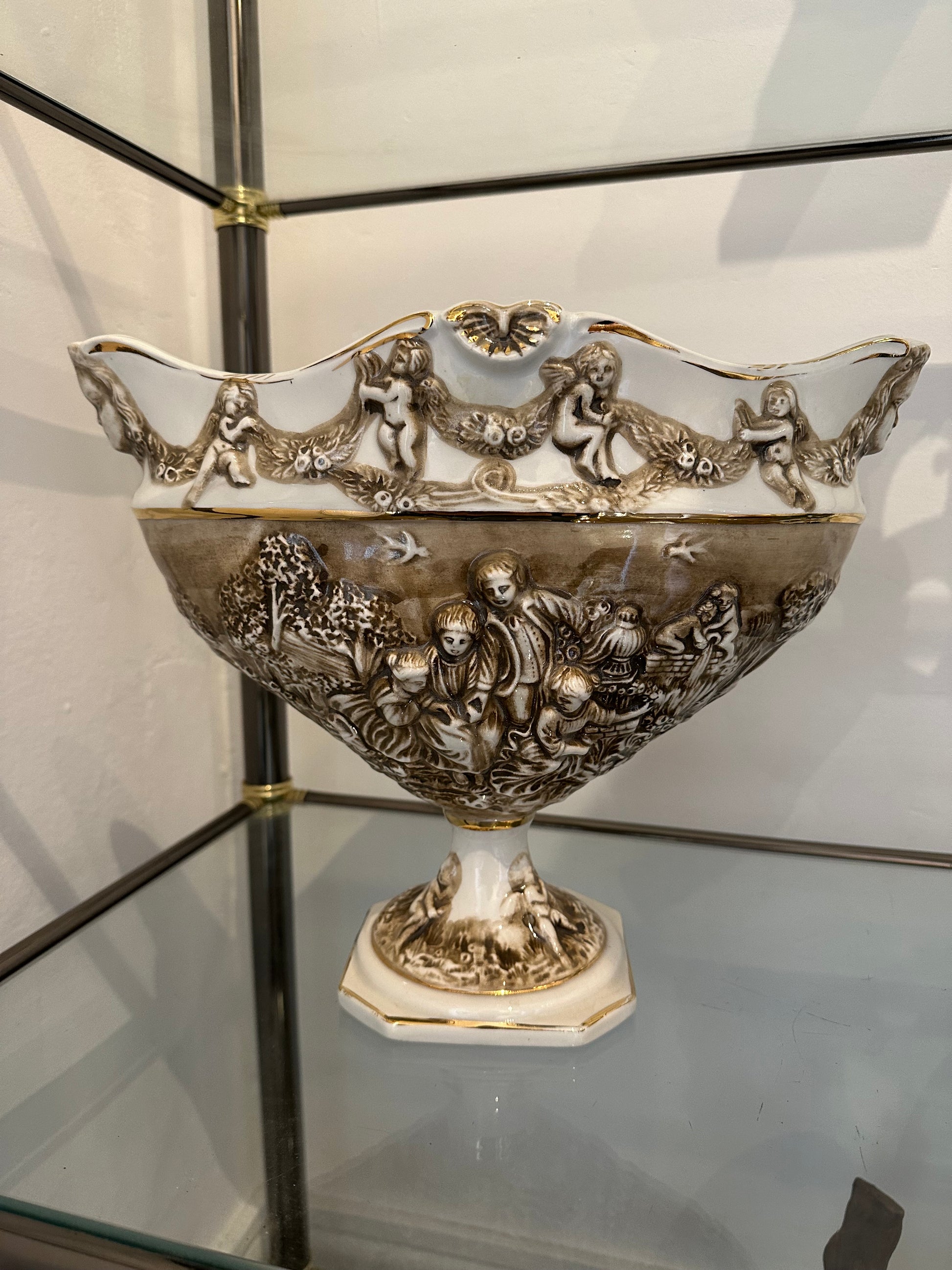 Centro decorativo de gran tamaño, realizado en porcelana esmaltada de la firma Capodimonte (Italia). Presenta decoración en altorrelieve con escenas de querubines, personajes en paisajes naturales y cenefas en forma de guirnaldas florales. Detalles pintados a mano en tonos sepia y remates con filo dorado. Una pieza sofisticada para destacar en cualquier vitrina o aparador clásico