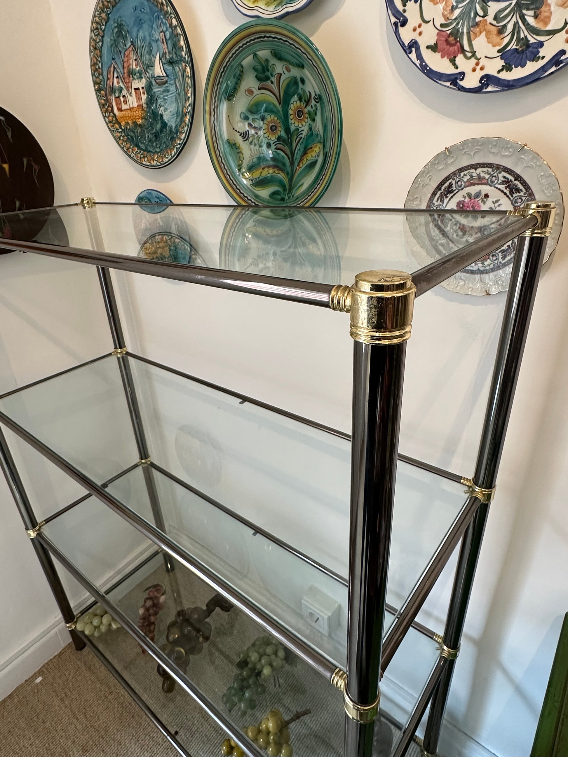 Estantería vintage de cristal y metal cromado con detalles dorados