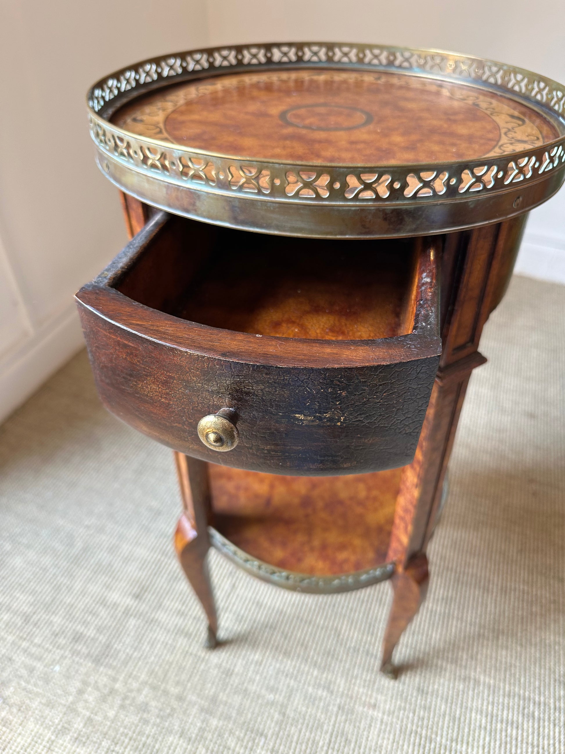 Mesita auxiliar vintage redonda en madera con un cajón y bandeja inferior, decorada con galería metálica calada. Ideal como apoyo en salón, dormitorio o rincón especial.