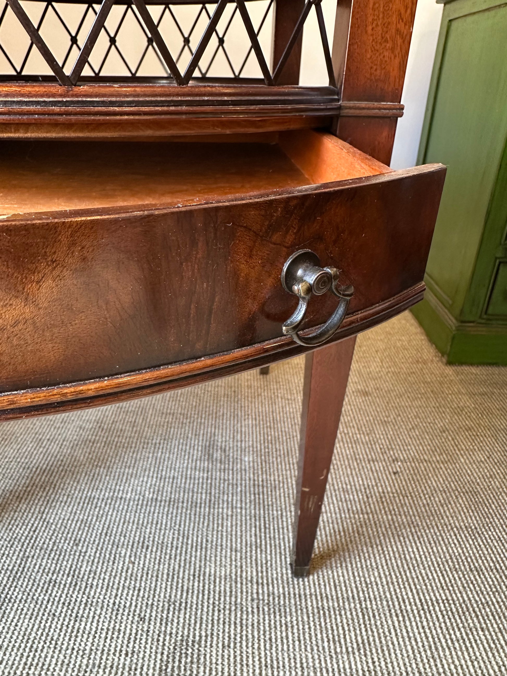 Estas mesitas auxiliares combinan la nobleza de la madera con detalles decorativos como celosía de rombos y tapa revestida en cuero repujado. Perfectas como mesitas de noche o auxiliares en salones clásicos.