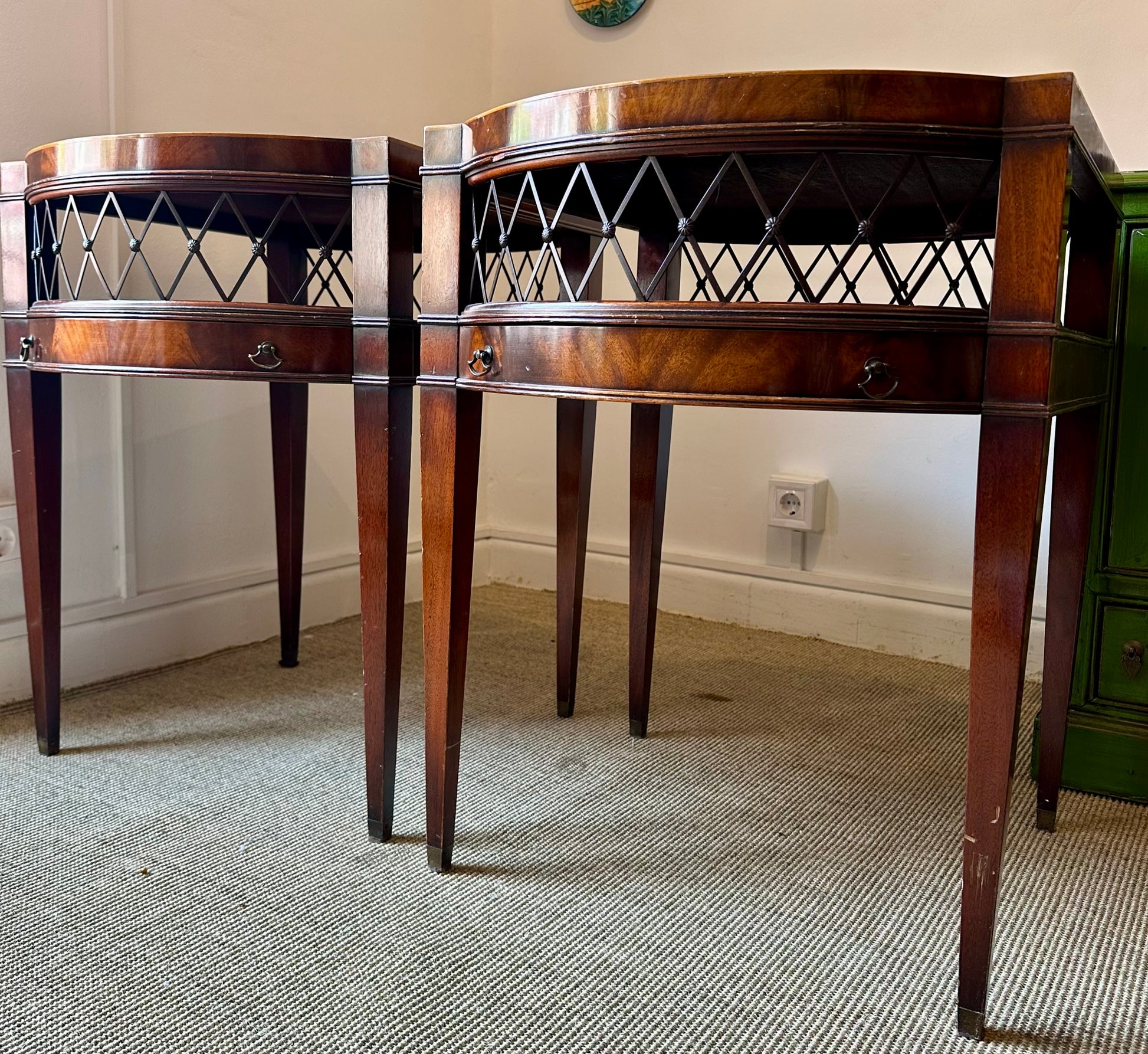 Estas dos mesitas auxiliares son un ejemplo refinado del mobiliario clásico de mediados del siglo XX. Realizadas en madera maciza de tonos cálidos, destacan por su elegante forma curva, sus patas rectas con molduras decorativas y la singular celosía de rombos que decora los laterales y parte frontal.